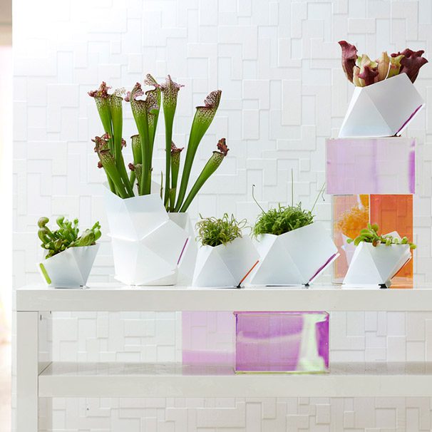 Las plantas carnívoras de tamaño pequeño se pueden presentar en conjunto como una mini-variedad, mientras que los especímenes más grandes lucen mejor en solitario en su propia maceta. La originalidad de estas plantas contrasta maravillosamente con modernas macetas con formas geométricas. Para aportar naturalidad a la propuesta decorativa, se pueden complementar con corteza, piedras y plantas acuáticas.