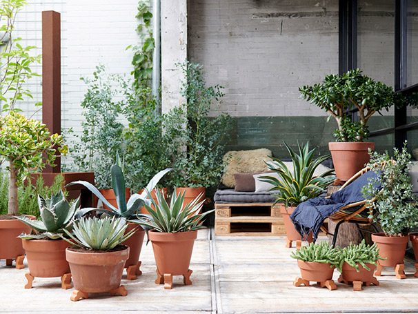 Aunque no lo parezca, se puede crear una escena veraniega imitando a una pequeña terraza con Agave, Eucalyptus, Aeonium y Crassula en simples macetas de terracota en las que descansen sus hojas estilizadas, proporcionando una visión general.