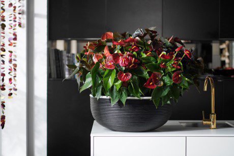 Los Anthurium rojos, blancos y verdes se prestan para las decoraciones navideñas de estilo contemporáneo en recipientes brillantes de color negro, planta y oro.