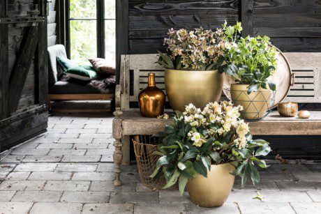Para una presentación acorde con el mes de diciembre, se puede acompañar al Helleborus de Cyclamen, té de montaña, brezo, musgo, madera, accesorios de Navidad y pequeñas luces para exteriores.