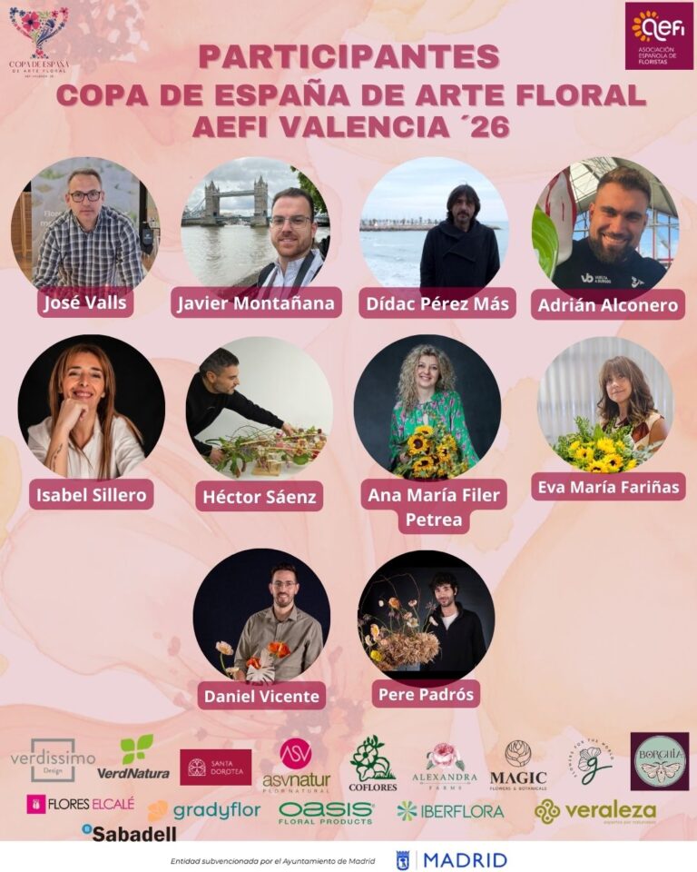 La Copa de España de Arte Floral AEFI Valencia 2026 se acerca y es un placer presentar a los 11 floristas que competirán en esta gran cita del arte floral, que se celebrará del 27 de febrero al 1 de marzo de 2026.